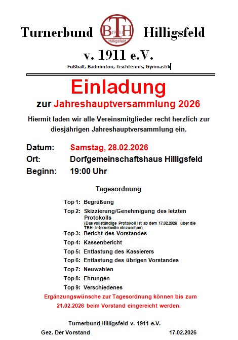 Am Samstag, 28.02.2026 ist wieder Jahreshauptversammlung angesagt. Ab 19.00 Uhr im Dorfgemeinschaftshaus Hilligsfeld gilt es wieder, Rückschau auf das vergangene Sportjahr zu halten und die Weichen für das nächste zu stellen. Alle TBH-Mitglieder sind herzlich eingeladen!